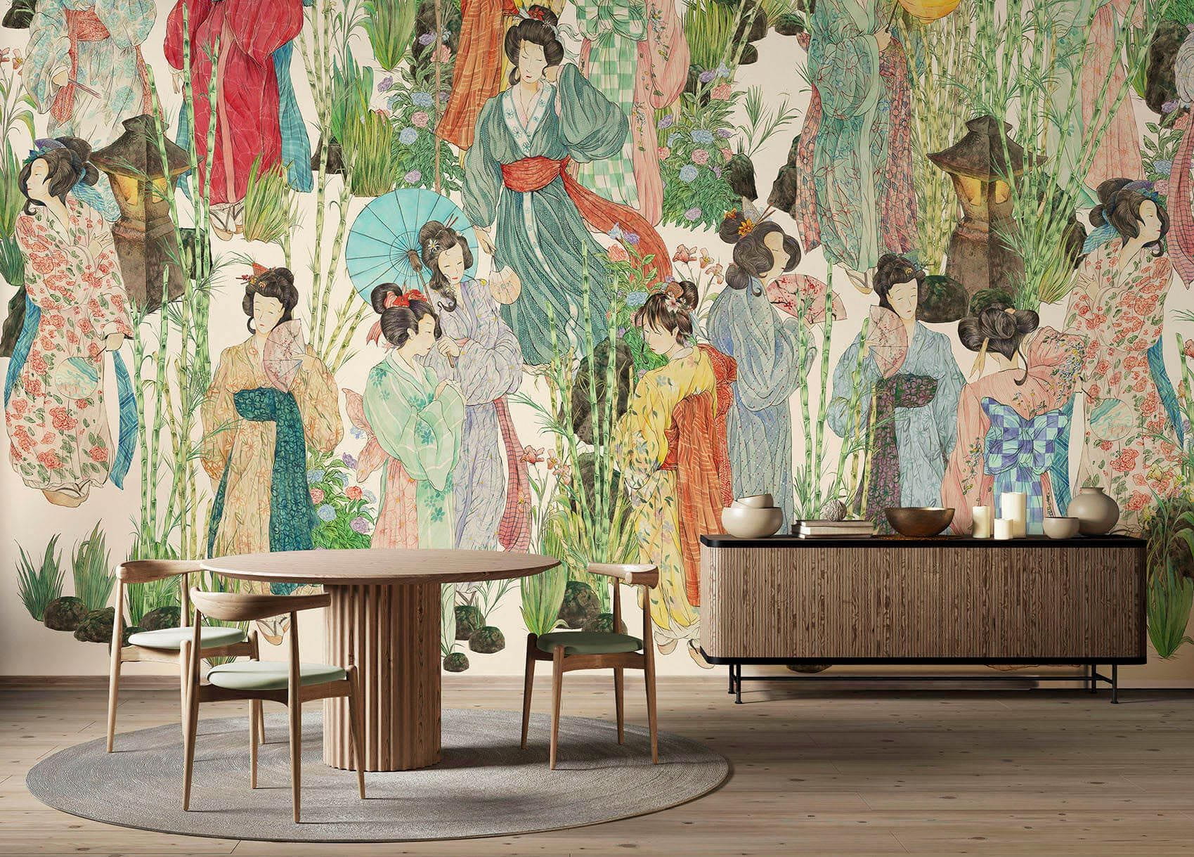 Mural Wallpepper 2024 Kimono GA-01-B przedstawia gromadę kobiet ubranych w tradycyjne stroje japońskie w otoczeniu różnorodnych roślin. Ich delikatne sylwetki tworzą harmonijną kompozycję z bogactwem naturalnych motywów. Dostępny jest w 3 wariantach kolorystycznych - dwóch w żywych barwach, i jednym czarno-białym, dzięki czemu idealnie dopasujesz ten model do swoich przestrzeni. Wallpepper GA-01-B 2024 Kimono - mural w japoński motyw wprowadza do wnętrz orientalny klimat i doda im subtelnego uroku i elegancji. Każdy detal został dopracowany z ogromną dbałością, co zaowocowało tym, że obraz ma żywy i designerski charakter. Pasuje do bardzo wielu stylów aranżacyjnych, ale przede wszystkim do tych klasycznych, orientalnych i chinoiserie.