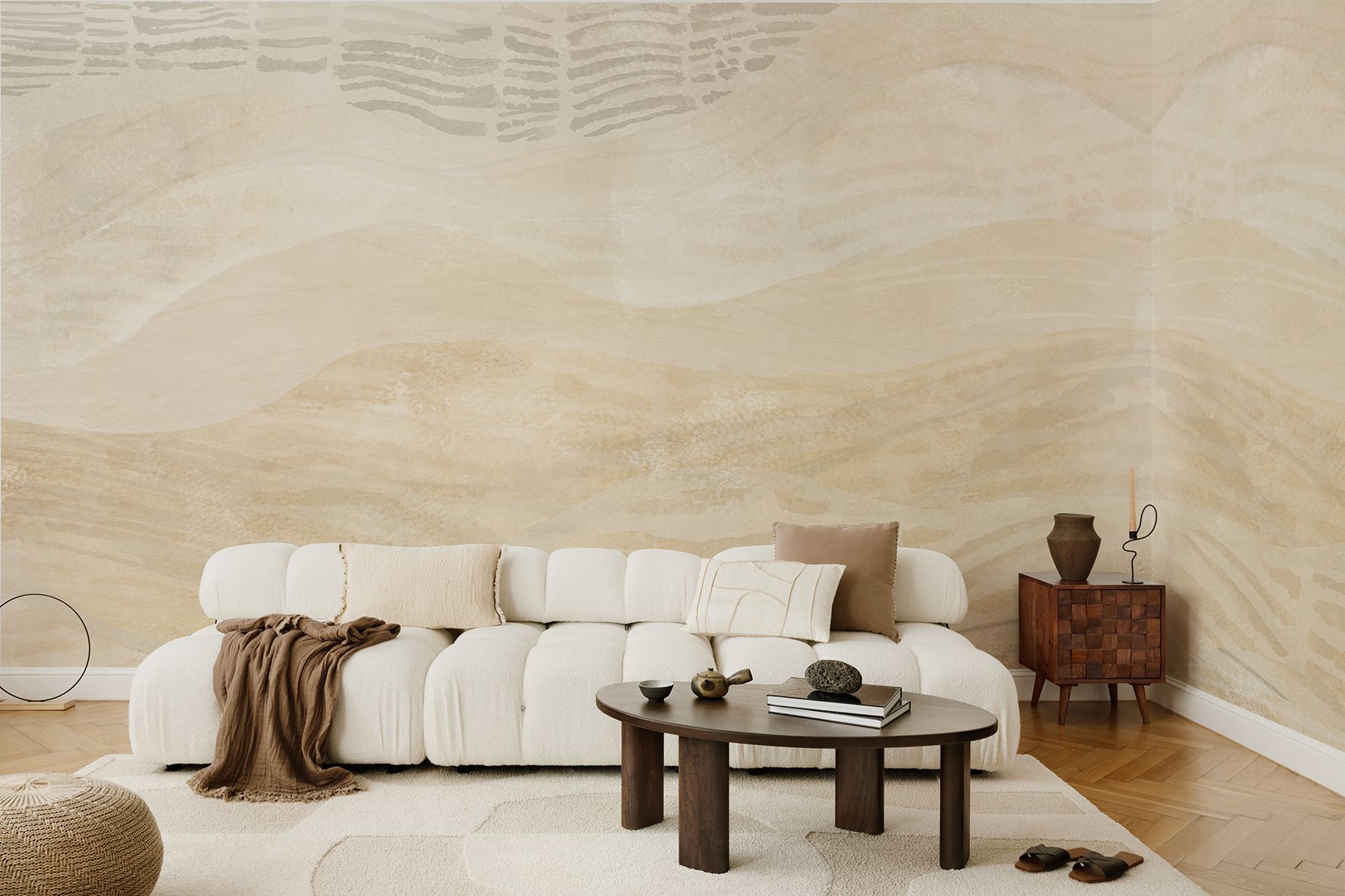 Mural Wallpepper 2025 Sahara WP-174 A emanuje spokojem zaklętym w organicznych warstwach barw przypominających wietrzne wydmy i miękkie kontury pustynnych formacji. Kompozycja balansuje na granicy abstrakcji i naturalnego pejzażu, tworząc harmonijną przestrzeń pełną subtelnych przejść tonalnych. Ciepłe beże, piaskowe odcienie oraz świetliste akcenty budują wrażenie głębi i łagodnego ruchu. Mural Wallpepper WP-174 A 2025 Sahara działa jak neutralne tło i jednocześnie pełnowartościowy element dekoracyjny, który wzbogaca aranżację bez efektu dominacji. Doskonale koresponduje z fakturami naturalnych materiałów – drewna, kamienia, lnu – wydobywając ich szlachetność i wprowadzając atmosferę luksusowego minimalizmu. Lekko rozproszone linie w górnej partii muralu nadają kompozycji rytmu, który łagodnie prowadzi wzrok, uspokajając i wyciszając wnętrze w duchu współczesnego designu biophilic.