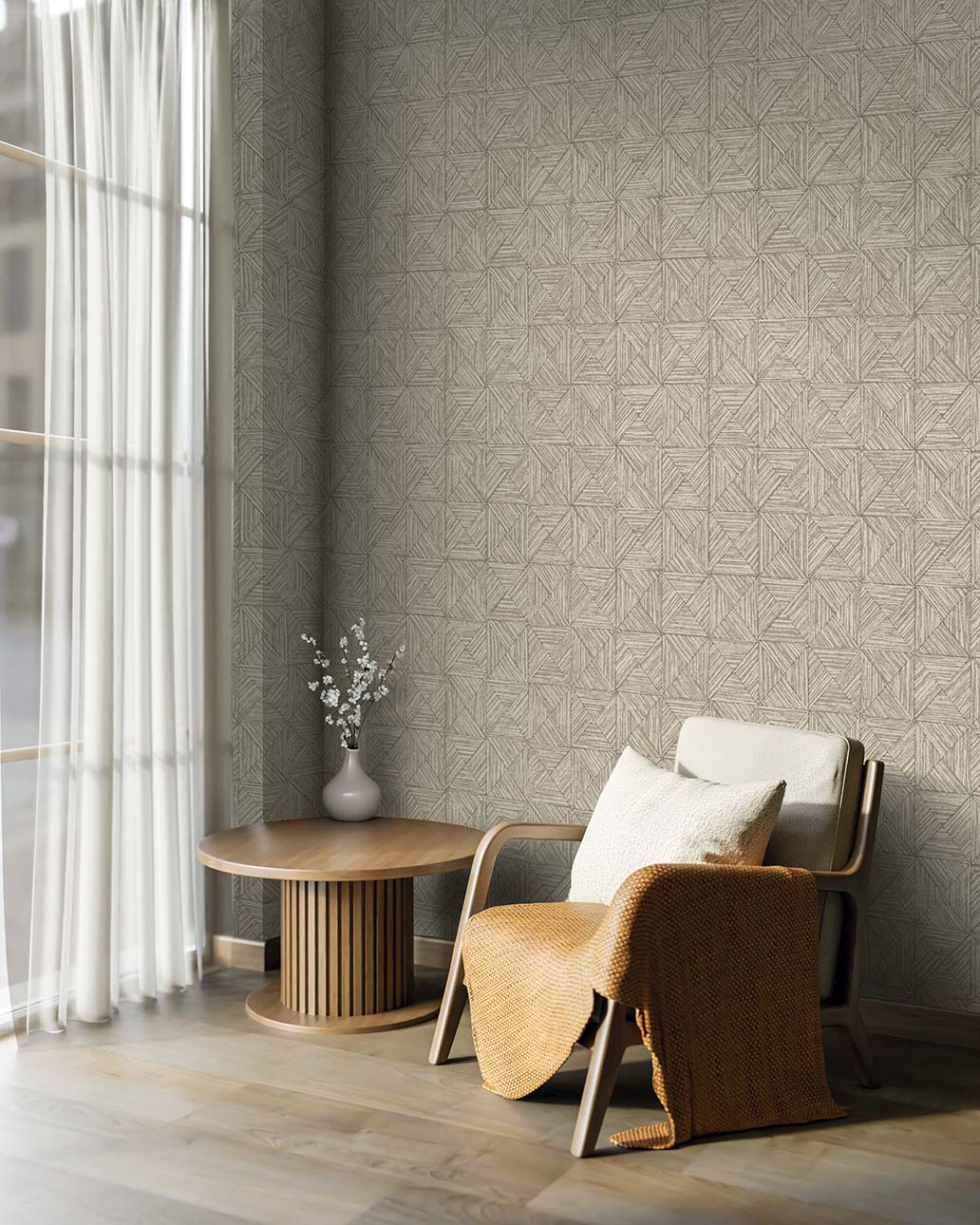 Tapeta Wallquest Neutral Elements Lunoria Burlap EL20507 harmonijnie wpisuje się w aranżacje w stylu modern classic oraz japandi, gdzie liczy się równowaga między uporządkowaną formą a naturalną estetyką. Wzór inspirowany tradycyjnymi parkietami tworzy na ścianie efekt dekoracyjnej mozaiki, opartej na rytmicznym układzie geometrycznych segmentów. Taka kompozycja porządkuje przestrzeń i wprowadza wrażenie architektonicznej precyzji. Zróżnicowane kierunki linii oraz subtelna faktura nadają powierzchni głębię wizualną i wyraźną strukturę, wzbogaconą o starannie opracowane detale. Motyw nawiązuje do klasycznych technik rzemieślniczych, interpretowanych w nowoczesny, lekki sposób. Flizelinowy podkład zapewnia stabilność wymiarową i precyzyjne dopasowanie podczas montażu, natomiast powierzchnia przystosowana do przecierania ułatwia codzienną pielęgnację. Tapeta Wallquest EL20507 Neutral Elements Lunoria Burlap sprzyja budowaniu wnętrz spójnych kompozycyjnie, opartych na rytmie, proporcji i konsekwencji stylistycznej. Dzięki niej przestrzeń zyskuje wyraźną strukturę, przytulny charakter oraz poczucie dopracowanej, harmonijnej całości.