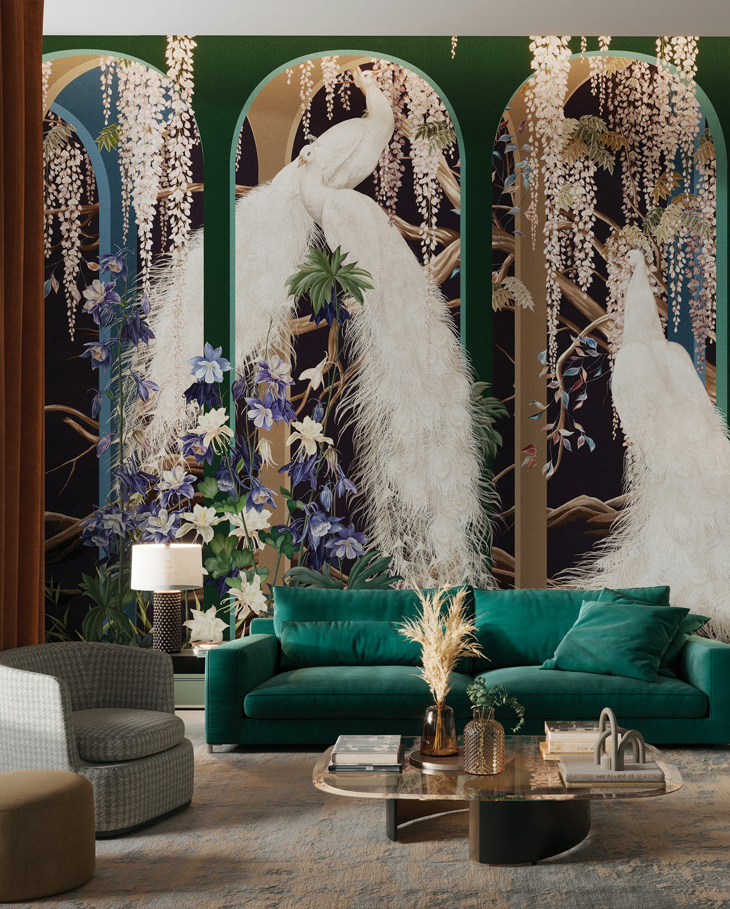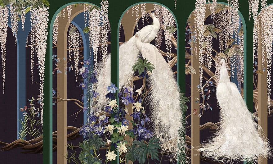 Wonderwall 35 0545 01 Verona - mural z motywem kaskad kwiatów, gałęzi i białych pawi