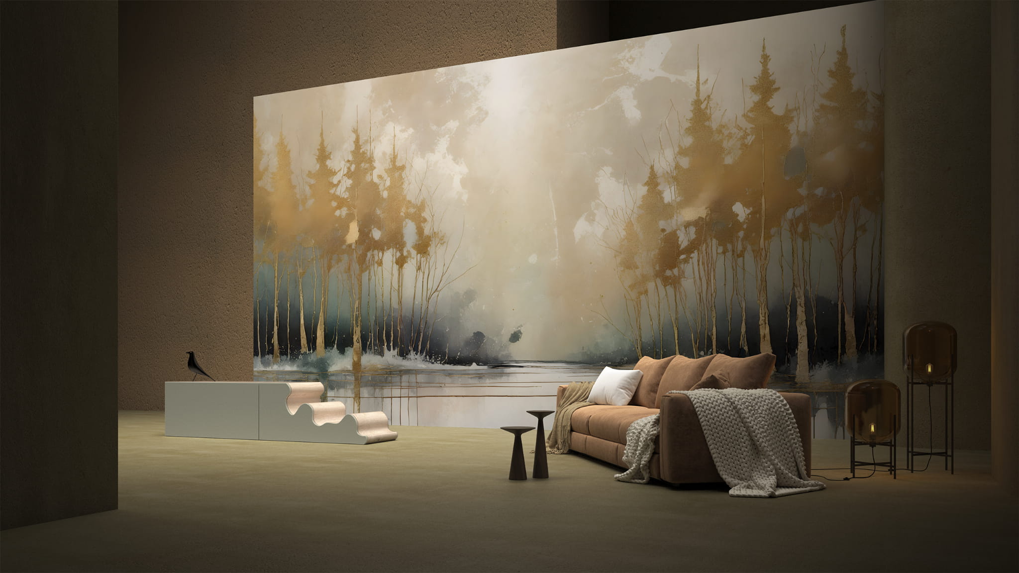 Mural Yo2 Cover Delusion COD3.04.2 przedstawia leśny krajobraz w artystyczny sposób. Dekoracja każdemu wnętrzu doda elegancji i oryginalności. Drzewa w złotym odcieniu pięknie łączą się z rozmytym, zamglonym tłem - oba te elementy tworzą wyrafinowaną kompozycję o subtelnej dynamice. Dzięki umiejętnie dobranej palecie barw mural Yo2 Cover Delusion COD3.04.2 wprowadzi do przestrzeni głębię i wizualny spokój. Doskonale sprawdzi się w nowoczesnym salonie, jadalni czy luksusowym biurze. Dekoracja pięknie zintegruje się z naturalnymi materiałami, takimi jak drewno i kamień, oraz z metalicznymi akcentami, które podkreślają jej wyrafinowany styl. To propozycja, która łączy dzięki połączeniu nowoczesnej abstrakcji z motywem inspirowanym naturalnymi krajobrazami doda wnętrzom harmonii i szyku.