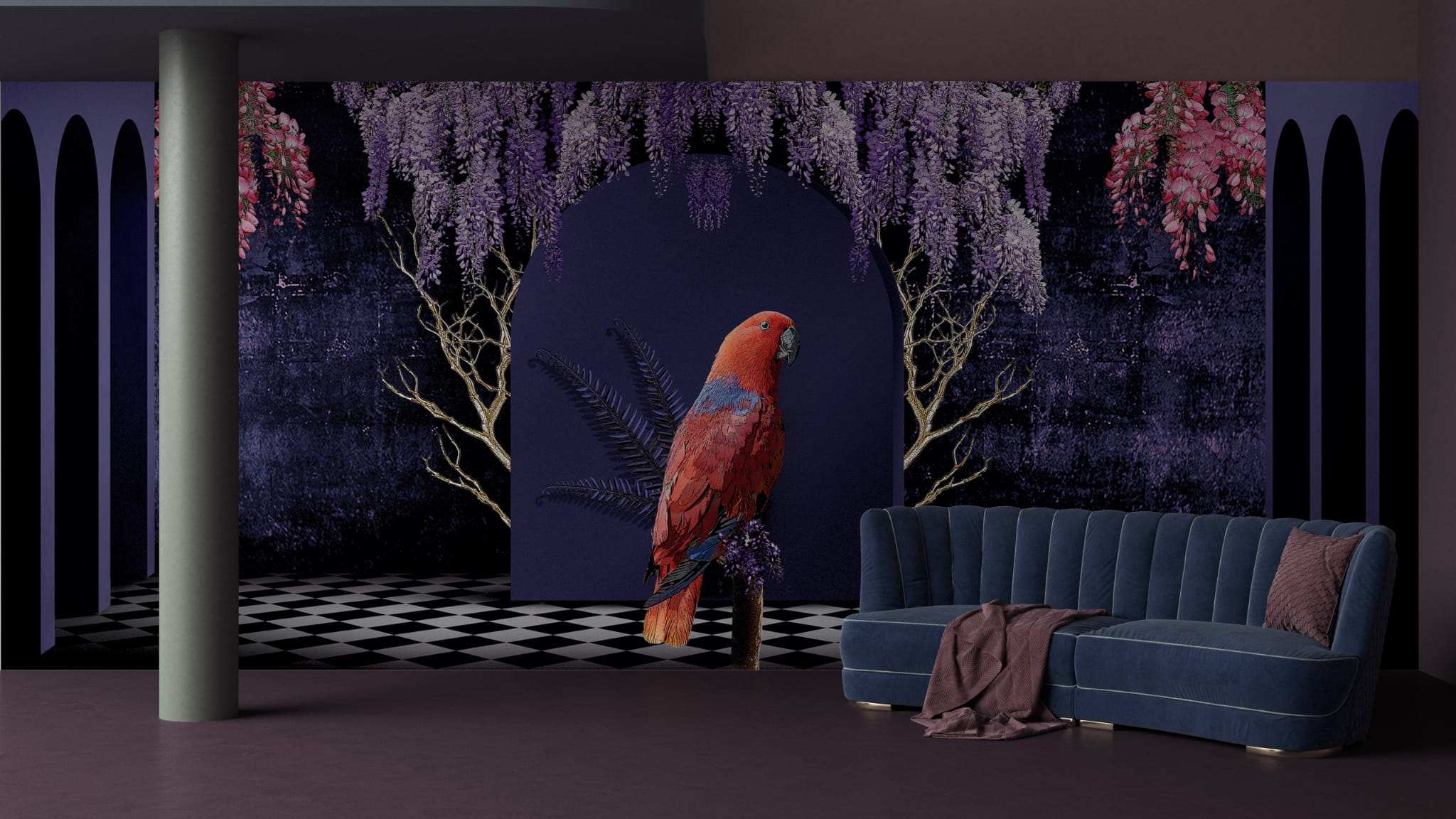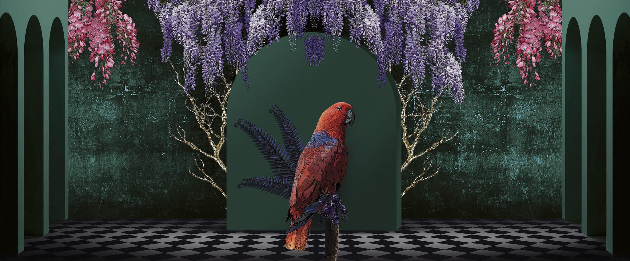 Mural Yo2 Fantasmagoria FA1.04.2 FF/GL to marzenie o magicznej przestrzeni bez żadnych wizualnych granic i granic rzeczywistości. Eklektyczny design, który kokietuje nieoczekiwanymi przedmiotami i stylami, z odważną paletą kolorów. Wykorzystując architekturę, łuki i czarno-białe podłogi w stylu wiktoriańskiej szachownicy, aby uzyskać wizualną iluzję perspektywy głębokiej przestrzeni. Ta kraina fantazji, zwieńczona gigantycznymi papugami, ma ściany i podłogi, które wyglądają jak sekwencja fantastycznych obrazów, takich jak te widziane we śnie. Rezultatem jest ten projekt, który jest pomysłowym sposobem na udekorowanie Twojego miejsca i nadanie wyjątkowego, estetycznego wyglądu Twojej przestrzeni. Ta kraina marzeń z pewnością rozjaśni Twoje codzienne życie. Witaj w mojej Fantasmagorii!Mural Fantasmagoria FA1.04.2 FF/GL został stworzony przez Ane Cvejic. Dekoracja doskonale odnajdzie się we wnętrzach klasycznych, art-deco, nowoczesnych, minimalistycznych, a nawet glamour. Model dostępny jest w ośmiu wersjach.